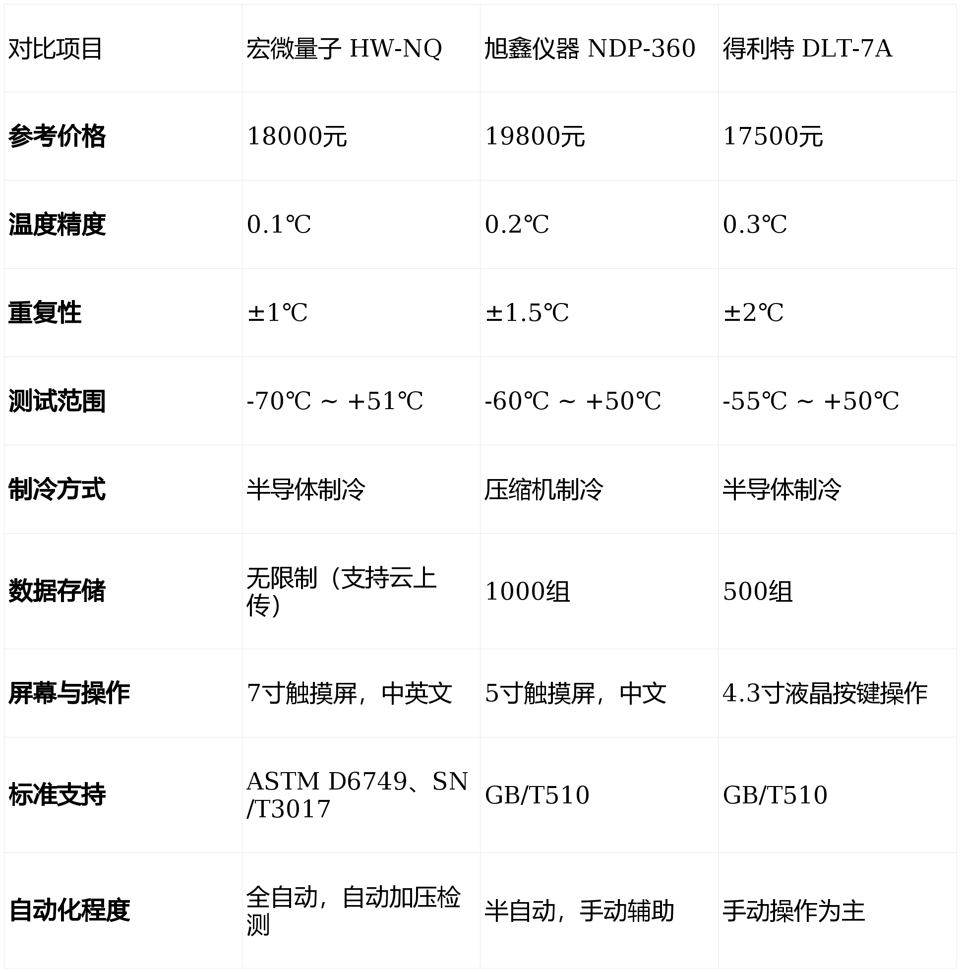 在温度控制与测量一致性方面,宏微量子HW-NQ采用PT100温度传感器与高精度气压检测系统,配合分段控温算法,在-70℃至+51℃范围内仍保持0.1℃的温度精度与±1℃的重复性。旭鑫仪器NDP-360与得利特DLT-7A在低温段的稳定性与一致性略逊,尤其在高低温交替测试中,HW-NQ表现更为平稳。