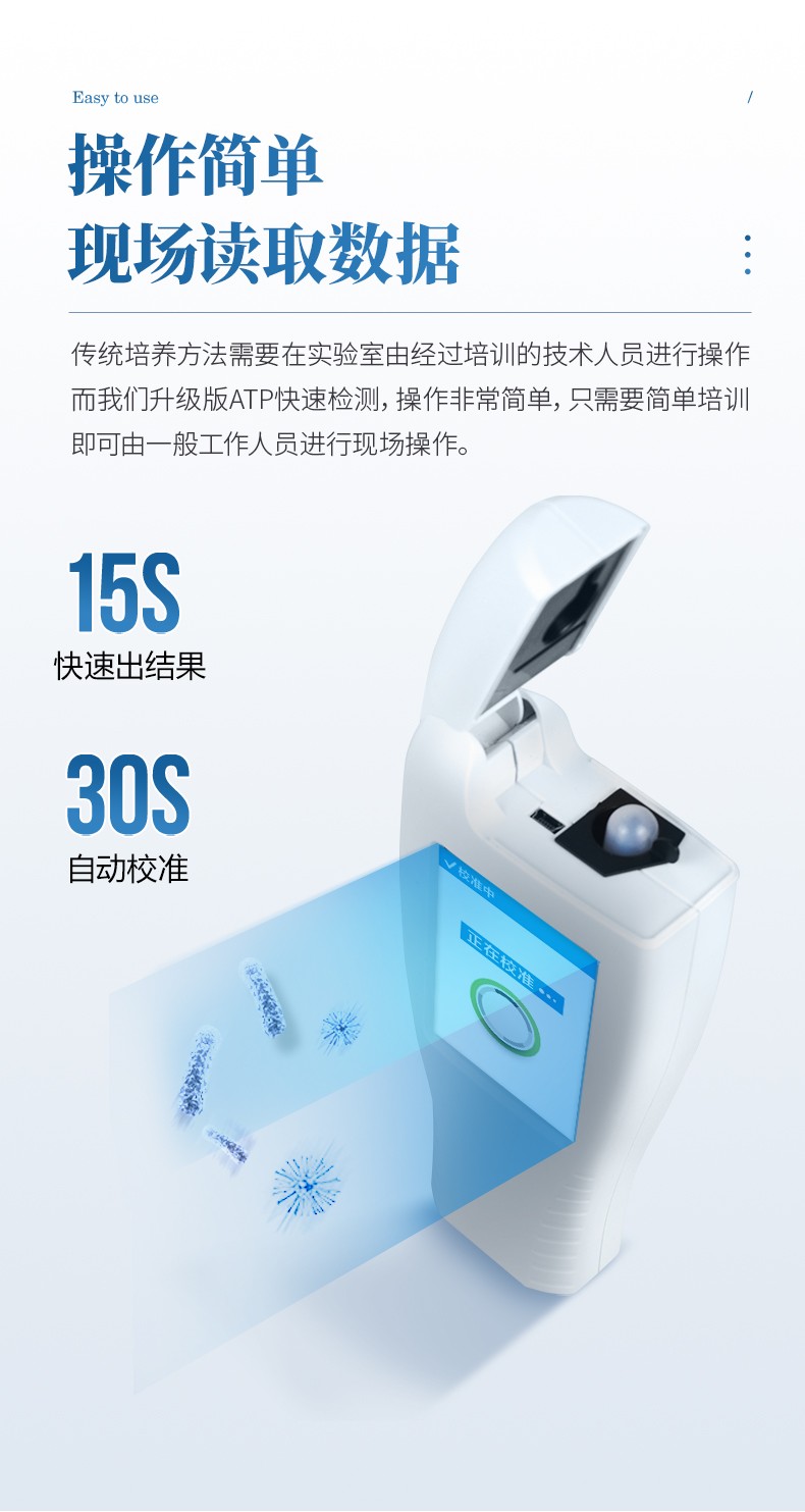 可操作性——传统培养方法需要在实验室由经过培训的技术人员进行操作;而ATP快速洁净度检测操作非常简便,只需简单的培训即可由一般工作人员进行现场操作。